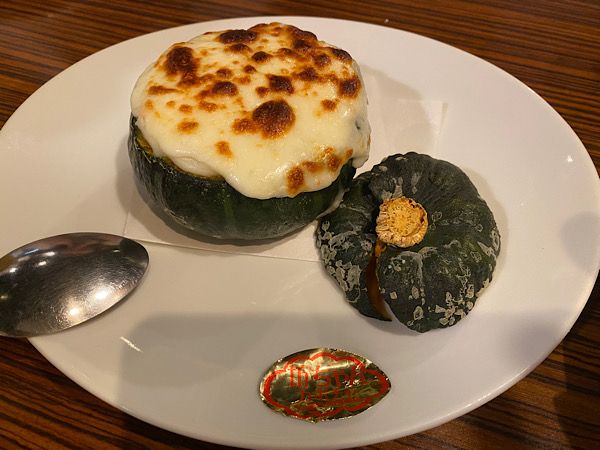 坊ちゃんかぼちゃのグラタン(またしてもお値段失念です)。 かぼちゃは皮ごと切り分けて全部いただけます。切り分けで盛り上がって、味でも盛り上がって、まるでパーティーのような気分にさせてくれました。