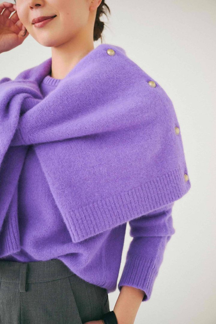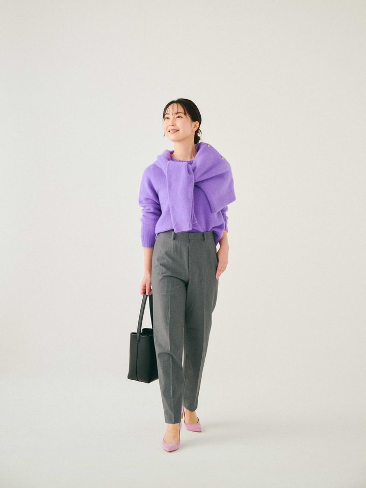 低身長さんは、太めよりも細めのパンツのほうが断然バランスよく着られます。アンサンブルニットは、肩がけのシルエットを少し変えるだけで、上半身にボリュームが出て、パンツとのバランスが良くなりおすすめです。(パンツはSサイズを着用)