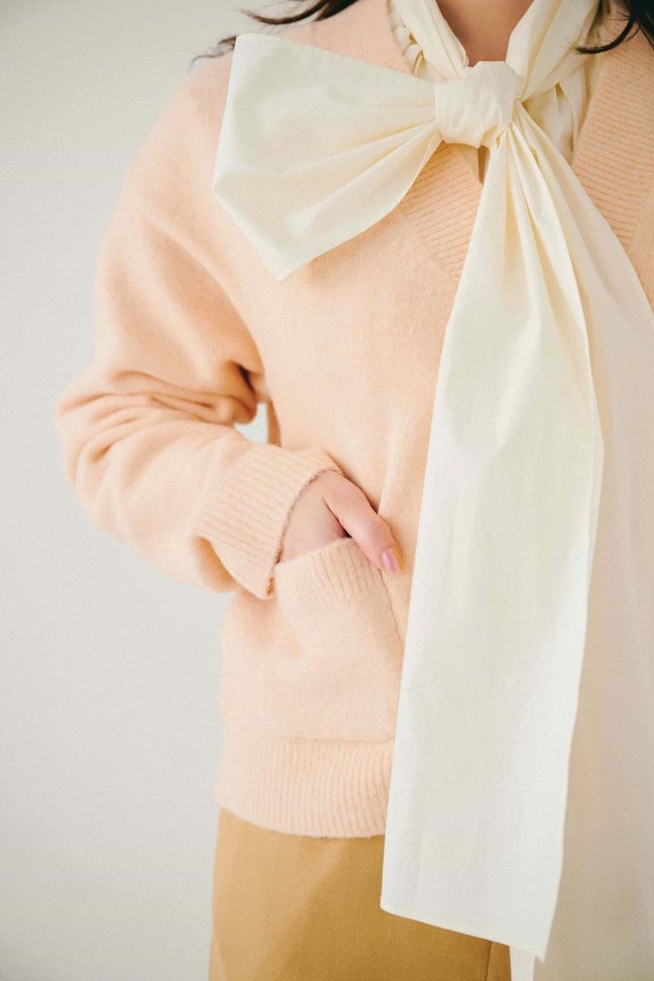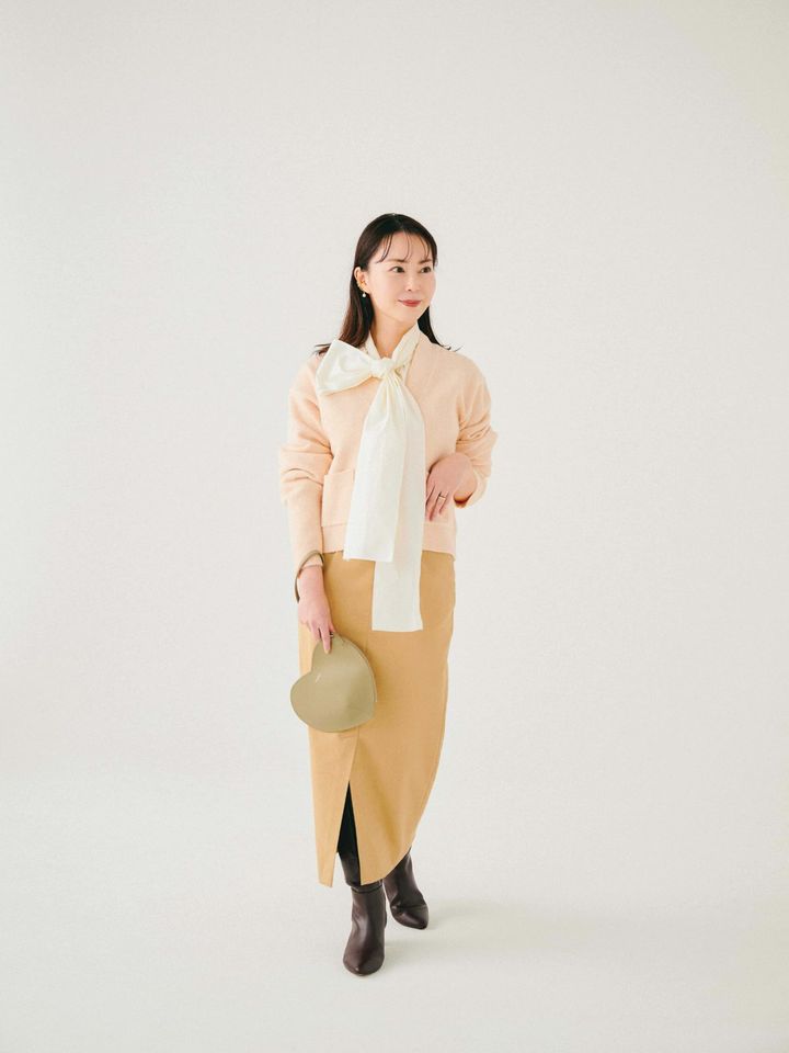 Sサイズにはバランスが取りやすい短め丈のカーディガン!中に着たリボンシャツのタイを垂らすことでIラインに。タイトスカートは前スリットで抜け感を出し、ロングブーツで繋げることで、さらに縦のラインを強調し、足長効果を狙いました。(カーディガンはSサイズを着用)