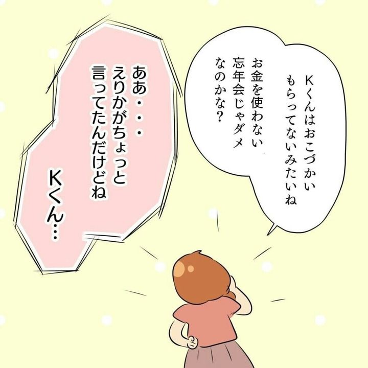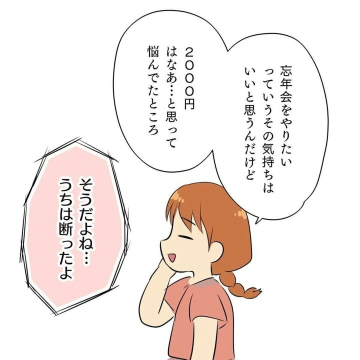 ママ友の電話は今まさに悩んでいたK君の忘年会の話でした。ママ友の娘・えりかちゃんも忘年会に誘われたものの、やはり2000円が引っかかり誘いを断ったとのこと。小学生にとっては安くない金額ですし、具体的にどういうことに使うのかがわからず、さらにK君はお金を出さないというのは納得できなくて当然のようにも思えます。