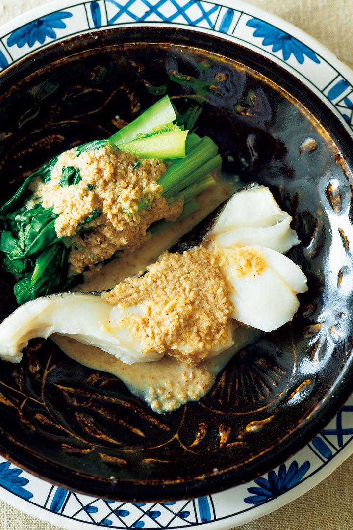 同じフライパンにたらを入れて、弱火(ぐらぐら煮立たない火加減が目安)で5分ほど静かに煮る。〈ゆずこしょうごまだれ〉の材料を混ぜる。小松菜がさめたら水けを絞り、長さ5~6cmに切る。たらを取り出してやさしく水けを拭き、小松菜とともに器に盛って、たれをかける。