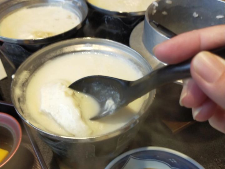 アルカリ成分を含む嬉野温泉水で煮ると、煮汁が豆乳色に変化し、豆腐がふわふわに溶け出します。とろみがあって、わが家の1歳児もたくさん食べました♩