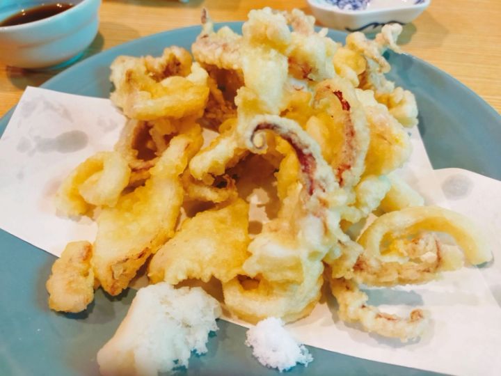 写真を見ていただければ伝わると思うのですが、私が食べたイカ、白色じゃなくて透明だったんです!それも透き通るほど無色透明! 海に浮かぶお店まで浅橋を渡っていくだけでワクワクするのに、お皿が見えるほど透き通った透明なイカを目にして気分は最高潮♩下足がまだ動く状態で届く新鮮なさばきたてのイカ。コリコリした食感で、噛むほどに甘みが広がります。
