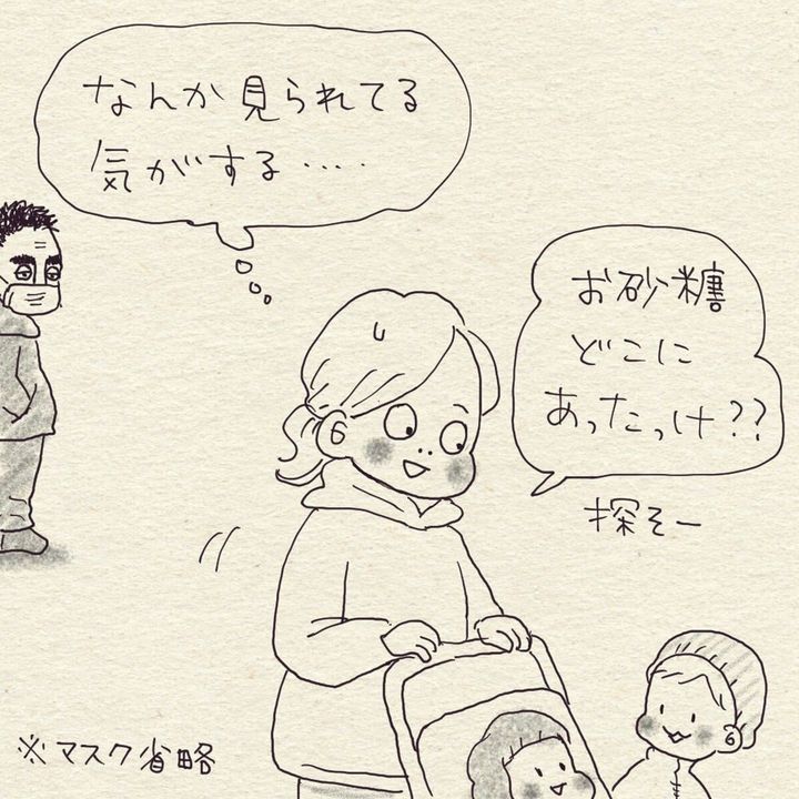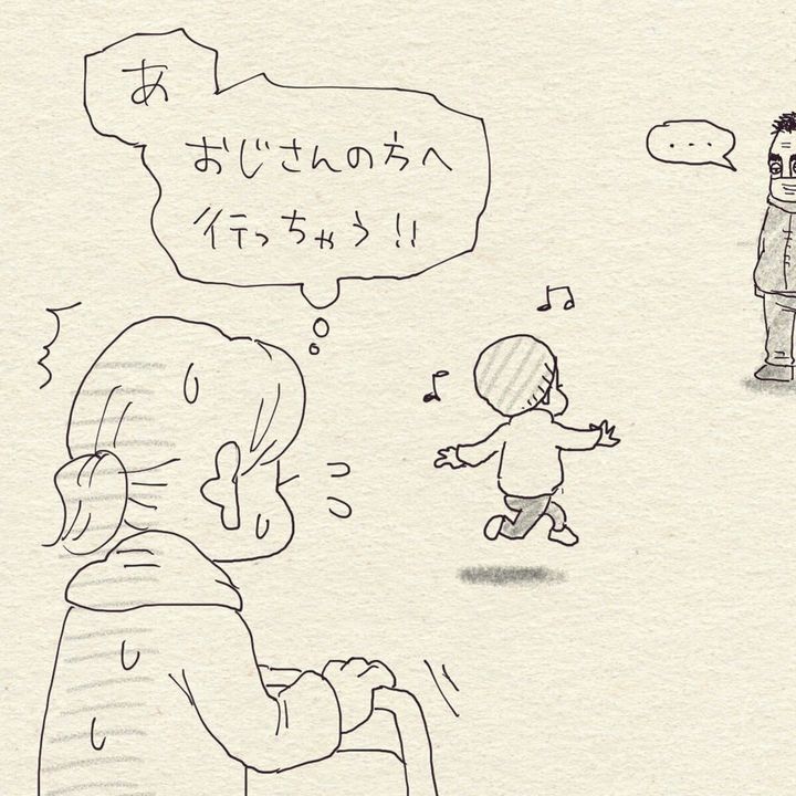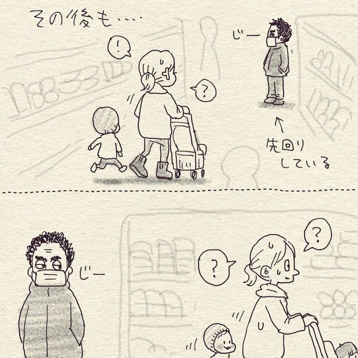 スーパーで買い物中に、見知らぬ男性からの視線を感じたこんぶ(@ookmboo)さん。怪しい人だと思い、気づかないふりをして買い物を続けていましたが、子どもがおじさんの方に向かっていってしまいました。その後のできごとにこんぶさんはびっくり。一体何が起きたのでしょうか?