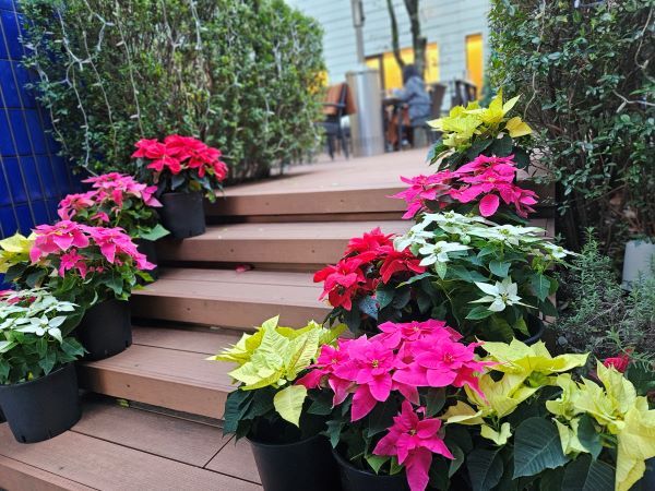 テラスのエントランスは色とりどりのポインセチアで飾られています。クリスマス感が高まりますね。