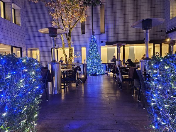 テラス席スペースの一番奥に、鮮やかなブルーの大きなサイズのクリスマスツリー! テラスを囲む樹木にもブルーのライトが輝いています。とても幻想的で美しいです。