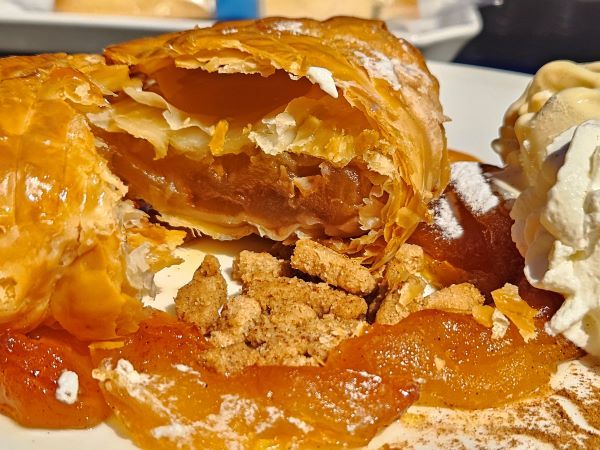 焼きたてアツアツアップルパイは、シナモンと洋酒で漬け込んだりんごを入れて焼き上げています。パイの中に入っているりんごとは異なる味わいと食感のりんごのソテーも添えられています。自家製アイスクリームと、たっぷりのホイップでいただきます。トップに飾られたラングドシャーはしっかりと焼かれていてとても香ばしい味わいと食感です。