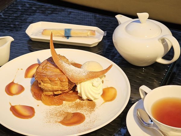 パイの下にはザクザク食感のクッキーが敷いてありました。味わいの異なるりんごの美味しさと、サクサクのパイと、クリーミーなアイスとクリームで口の中が美味しさでいっぱいです。別添えのキャラメルソースは、途中でかけてほろ苦さを楽しみました。本当に美味しいです。しっかりとした香りと味わいの紅茶とのペアリングも素晴らしいです。