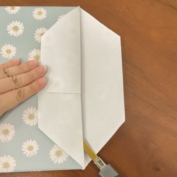 まず、紙の端が見えないように、包装紙の右側を表側に折り返します。
