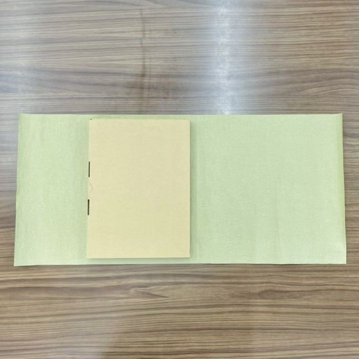 包装紙は、上下が中央で2cm程度重なり、色紙の四隅と包装紙の間隔が均等になるようにカットします。