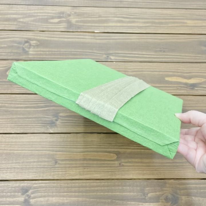 包装紙の重なった部分をシールで留めれば、たとう包みの完成です。