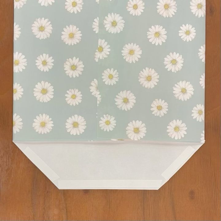 左右の包装紙が重なるように包装紙を折り、重なった部分を両面テープで留めてください。