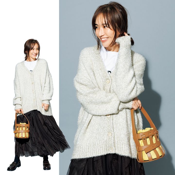 繊細な光を放つホワイトをベースにゴールドをミックスしたカーディガン。お疲れ顔の日に取り入れたい。ニットカーディガン¥34,100(プルミエ アロンディスモン)Tシャツ¥12,100(カデュネ)チュールスカート¥24,200(アルページュストーリー)バッグ¥24,200(リンク)ローファー¥11,500(CHARLES & KEITH)ピアス¥102,300(マリハ)靴下(スタイリスト私物)