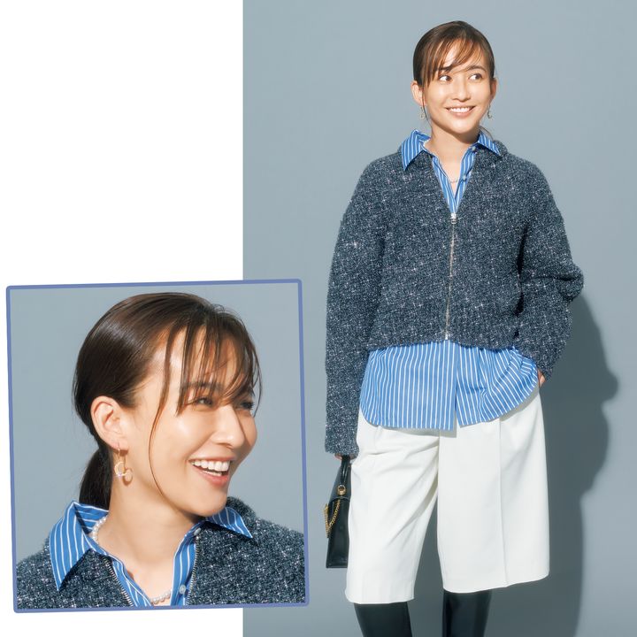 ホワイトをベースにした輝くカーデでワントーン明るい肌に