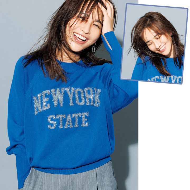 ロゴ部分だけに輝きがあしらわれたニットはラフな着こなしが好きな人におすすめです。少しだけきらりとするだけでパッと華やぐので合わせるアイテムはもちろんシンプルに、格好良く仕上げるのが正解。メイクにも抜け感がある方がバランスよくキマります。ニット¥19,800(アルページュストーリー)パンツ¥25,300(カデュネ)ピアス¥3,850(ヘンカ/ロードス)