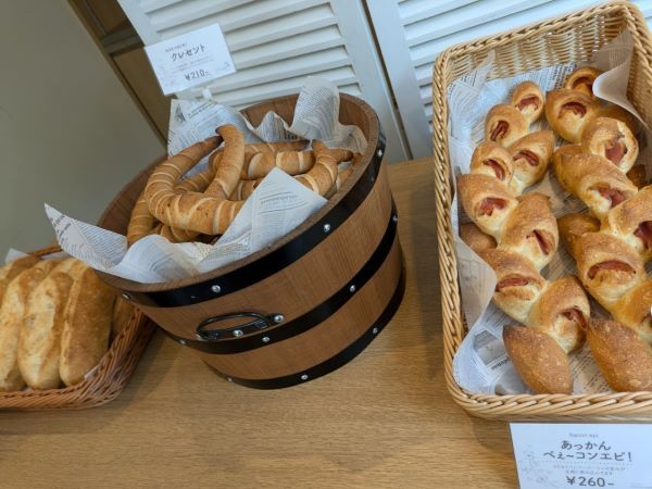 シンプルなパンが好きな人にはたまらないクレセントは、端っこはカリッと、中はもっちりしていて、 噛むほど美味しいんです。その隣には、一見普通のベーコンエピがあるのですが、思わず笑いのツボに入ってしまい、数分肩を揺らしていました(笑)。⁡その名も「あっかんべぇコンエピ!」