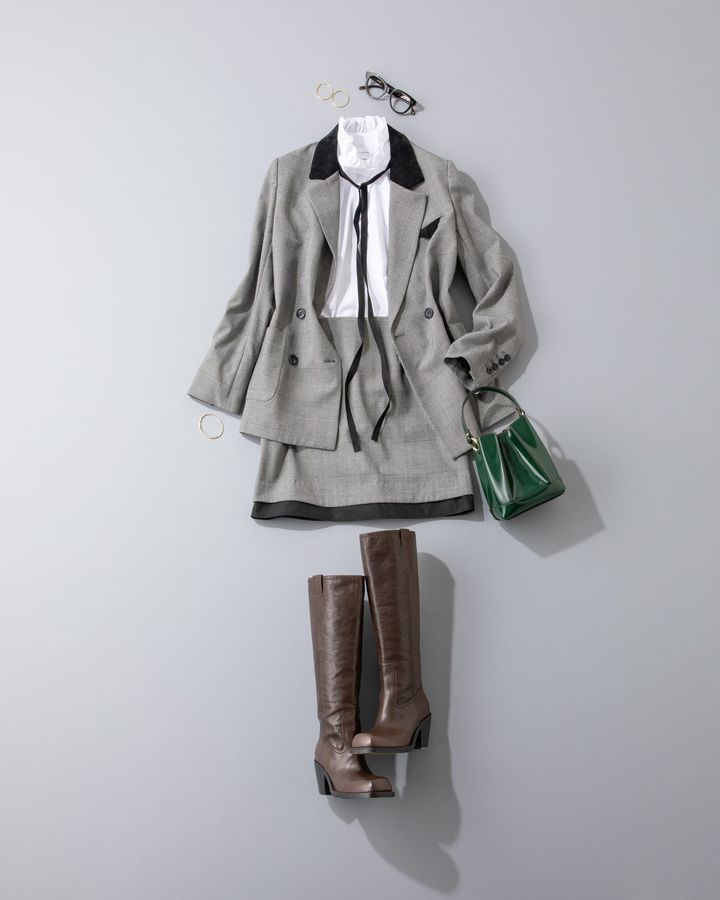 ミニスカートを全面に出しすぎないようにアウターで調整するのもオススメ。ジャケットや長めのジレなどを羽織れば、足を出していることの気恥ずかしさや心許なさを払拭してくれます。またセットアップにすることで、ミニスカートを全体に馴染ませる方法もオススメです!グレンチェックがトレンド感を、ロングブーツでトラッド感をONして、旬度の高い大人のこなれミニスカートコーデが完成します。