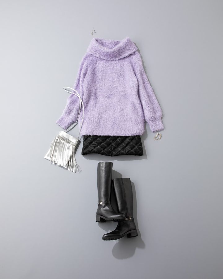 ミニスカートを着る上でトップスに合わせるサイズ感や素材も重要になります。大きめのざっくりニットを合わせるとバランスの良いコーディネートに。スカートの少しふっくらした素材と台形の形が、覗く足を華奢に見せる効果もあります。また、ロングブーツは足の露出が少なくなるのでミニスカートを穿く時の強い味方。バッグは今っぽくシルバーのをあわせ、トップスは明るいカラーで目線を上に持ってくるようにすれば、おしゃれなメリハリミニスカコーデが完成します。