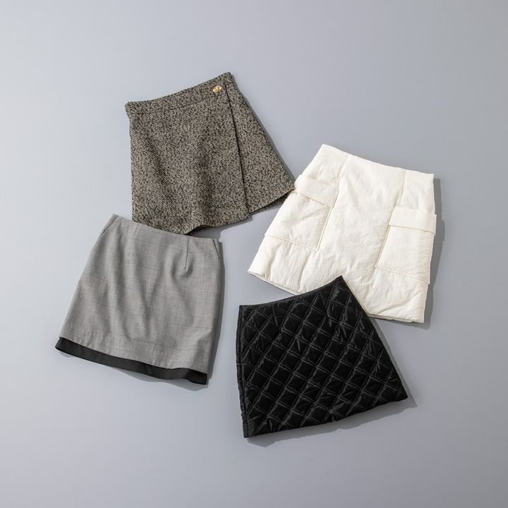 右から時計周りに ホワイトスカート¥19,800(アルページュストーリー)ブラックスカート¥44,000(ボーダーズ アット バルコニー)チェックスカート¥16,500ツイードスカート¥20,900(ともにカデュネ)