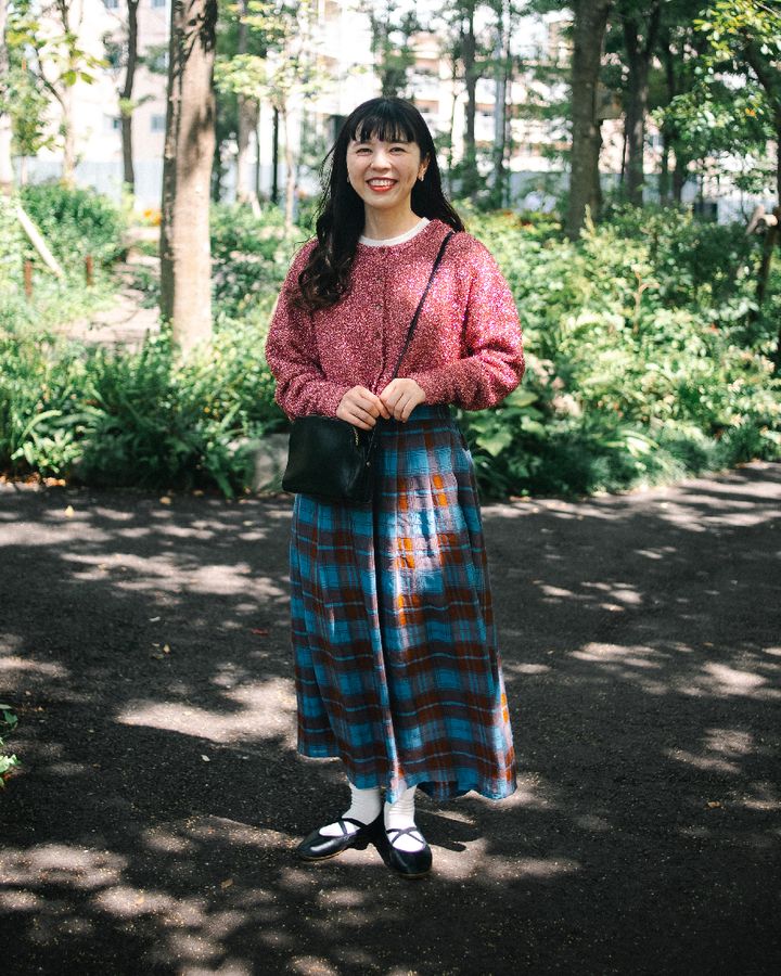 レディLiraのお気に入りはチェックのスカート。その装いのバリエーションは実にさまざまで、ユニークなマッチングがちょっと話題です。本日はプリーツスカートにゆったりサイズのスウェットシャツをON。脱スクールガールの秘訣はこだわりの靴とバッグにあり。