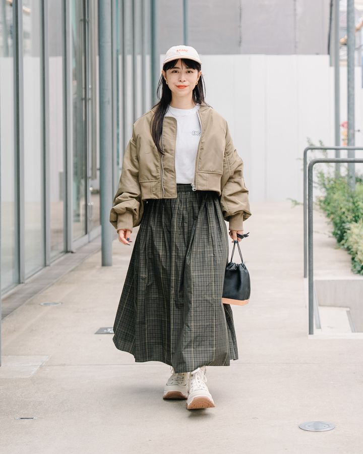 ショート丈のMA-1とふわっとボリュームスカートの絶妙バランスな甘辛コーデ