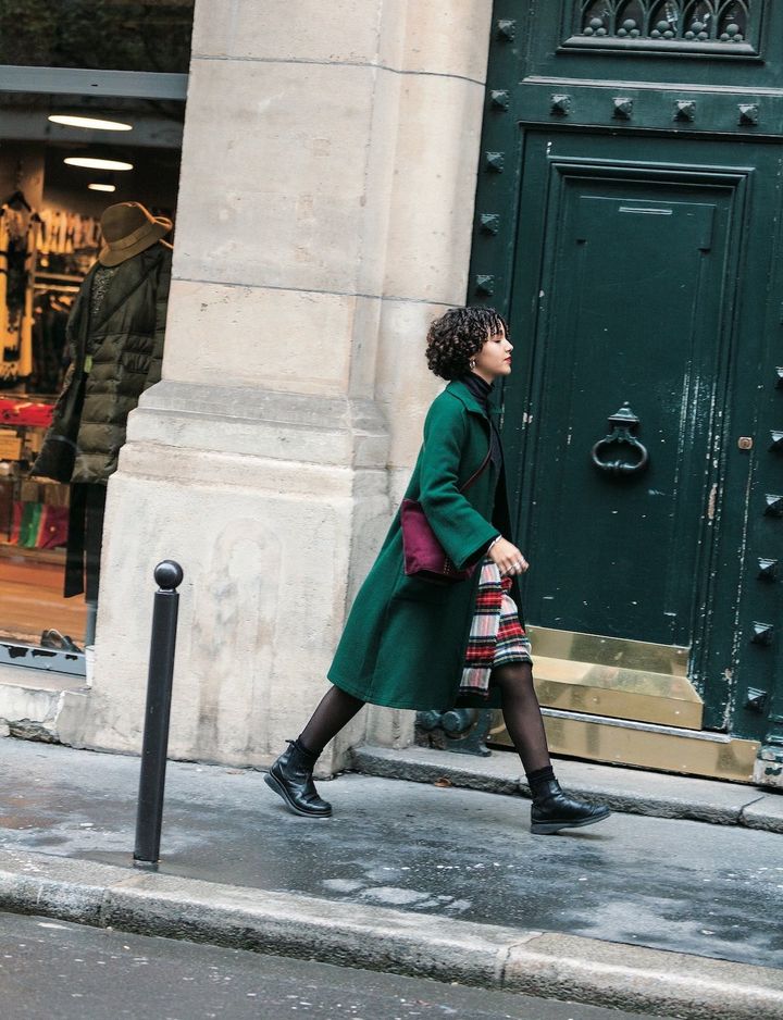 女性らしさを忘れないパリジェンヌは、チェック柄のアクセントをレディなスカートで投入。上品なグリーンのコートから覗くチェック柄が、装いを華やかに色付けてくれる。