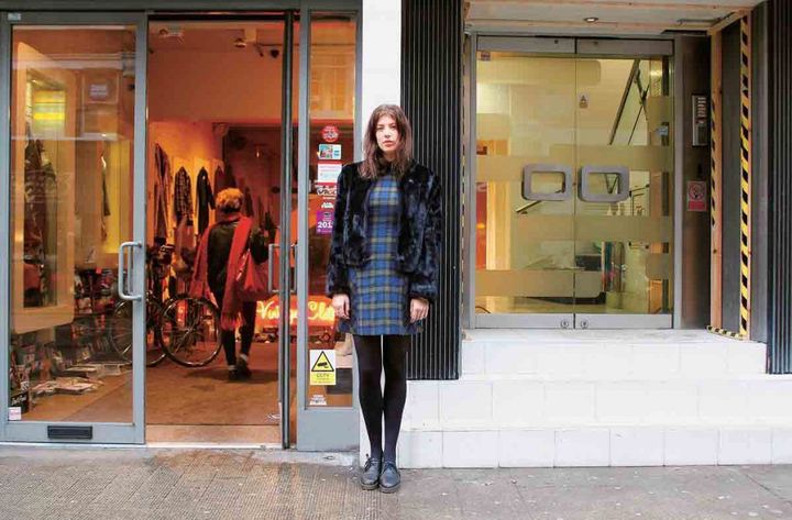 老舗百貨店〈リバティ・ロンドン〉にあるヴィンテージショップで働くエイミー。ロンドンガールを象徴するかのように、赤のタータンチェックを効かせたキルトスカートの着こなしを楽しんでいる。