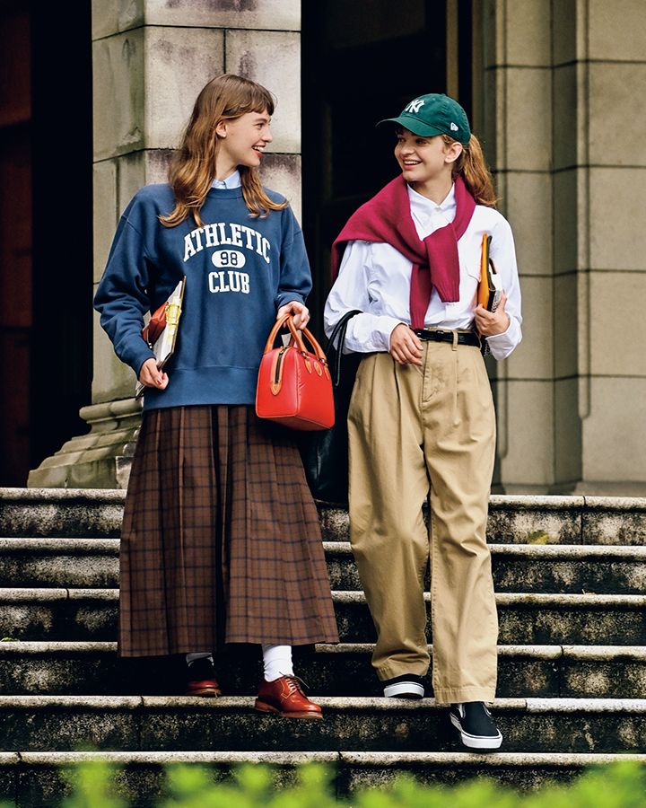 色落ちした感じのネイビーにイエローのロゴが入った、‟カレッジ風”のスウェットにキルトスカート&白ソックスでグッドガール風に仕上げた着こなし。スウェットの裾をスカートにインすると、リラックス感をキープしながらもきちんと感が出るので、トライしてみて。