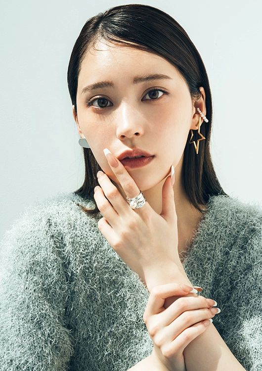 【右耳】ハートピアス(片耳販売)[SV925×メタル]¥18,700、【左耳】星ピアス(片耳販売)[SV925]¥28,600、イヤカフ(片耳販売)[樹脂パール×メタル]¥17,600、リング¥47,300[SV925×ガラスパール×キュービックジルコニア]/以上MAYU(マユ ショールーム) フェザー調アンサンブルニット¥18,700/CELFORDルミネ新宿2店