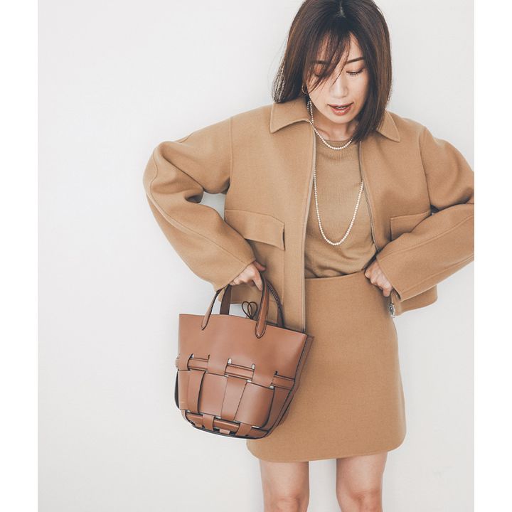 たっぷりとゆとりのあるシルエットと大きめポケットが可愛いブルゾンは、ベージュ×ブルーチェックとのリバーシブル。同素材の台形ミニスカートとセットで着れば、簡単にスタイルアップを実現。インナーとバッグもワントーンで揃えれば、レディなムードも高まる。