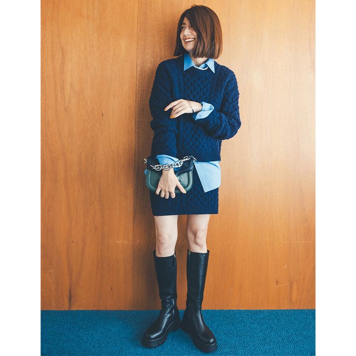ニット¥50,600スカート¥36,300(ともにTheory/リンク・セオリー・ジャパン)シャツ¥28,600(グラフペーパー/グラフペーパー 東京)バングル¥25,300(ウノアエレシルバーコレクション/ウノアエレ ジャパン)ネックレス¥12,100(Pearl for Life/ロードス)バッグ¥213,400(ピエール アルディ/ピエールアルディ 東京)ブーツ¥310,200(ジャンヴィト ロッシ/ジャンヴィト ロッシ ジャパン)