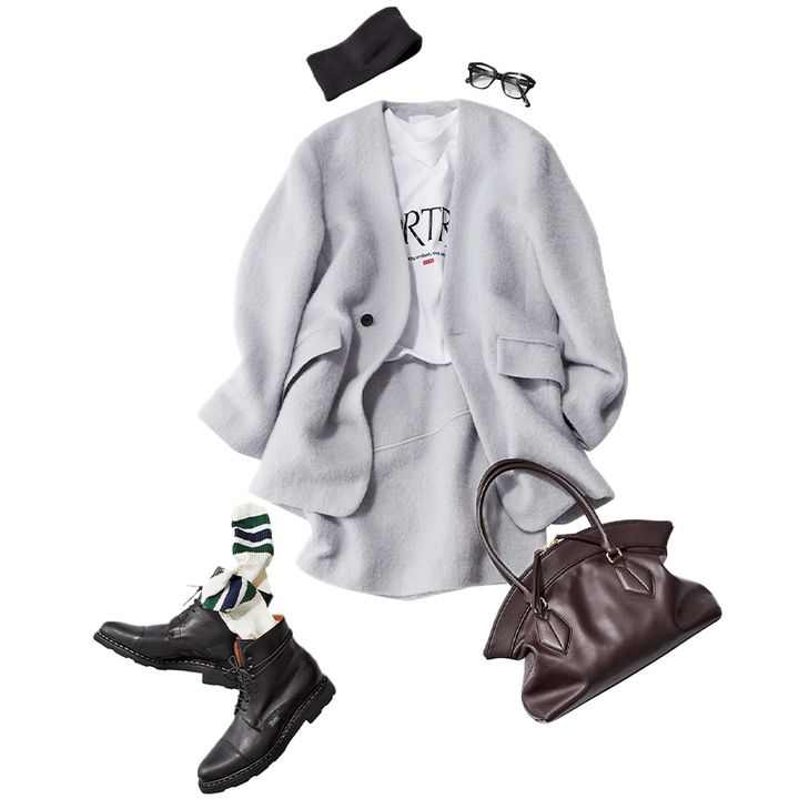 ジャケット¥35,200スカート¥18,700(ともにミースロエ/MIESROHE ルミネ新宿1店)Tシャツ¥35,200(システム/ユナイテッドアローズ 原宿本店)ヘアバンド¥3,850(オーバーライド/オーバーライド 神宮前)メガネ¥25,300(レイバン/ルックスオティカジャパン カスタマーサービス)バッグ¥114,400(フルラ/フルラ ジャパン)ソックス¥1,100(靴下屋/タビオ)シューズ¥99,000(パラブーツ/パラブーツ青山店)