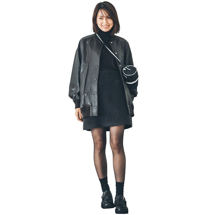 スカート¥27,500(アルアバイル)ブルゾン¥198,000(ブリル/ブリル新宿)タートルニット¥28,600(ポステレガント)ピアス¥29,700(ブランイリス/ブランイリス トーキョー)バッグ¥10,450(レスポートサック/レスポートサック ジャパン)ストッキング¥1,100 ソックス¥990(ともに靴下屋/タビオ)シューズ¥26,400(オデット エ オディール/オデット エ オディール 新宿店)