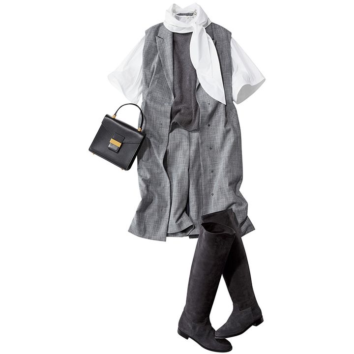 ジレ[共布ベルト付]¥35,200ハーフパンツ¥17,600(ともにルーニィ)ニットベスト¥36,300(ATON/エイトン青山)ブラウス¥29,700(デ・プレ)バッグ¥198,000(セルジオ ロッシ/セルジオ ロッシ カスタマーサービス)ブーツ¥121,000(ネブローニ)