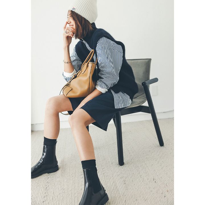 ショートパンツ¥29,700(ロエフ/エイチビューティー&ユース 六本木店)ニットベスト¥17,600(ミースロエ/MIESROHEルミネ新宿1店)シャツ¥26,400(ティッカ)カットソー¥11,550(スローン/ザ ショップ スローン 新静岡セノバ店)ニット帽¥8,580(ザ シンゾーン/シンゾーン ルミネ有楽町店)ブレスレット¥36,300 リング¥29,700(ともにウノアエレシルバーコレクション/ウノアエレ ジャパン)バッグ¥457,600 シューズ¥146,300(ともにトッズ/トッズ・ジャパン)ソックス¥990(靴下屋/タビオ)
