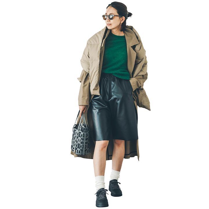 ウエストゴムでゆったりシルエットがはきやすいエコレザーショーパン。トレンチにダウンストールを重ねて、カジュアル感をアップ。
