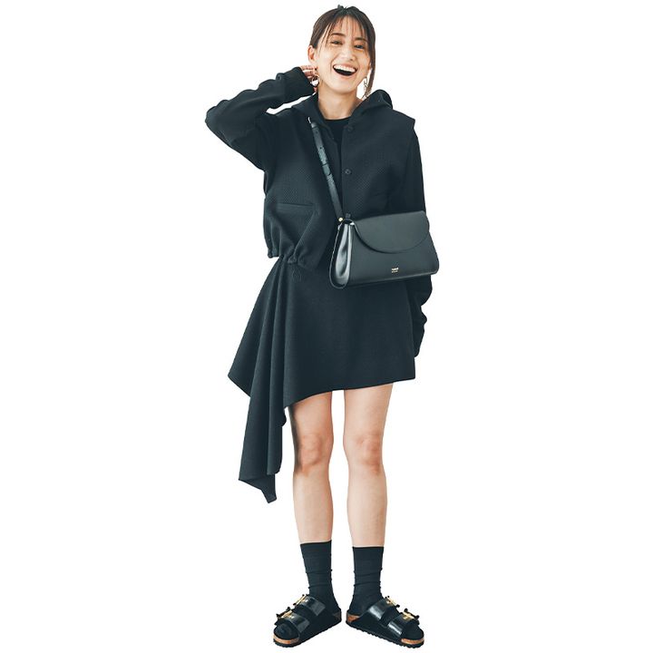 デザイン性のあるアイテムこそオールブラックに!甘寄せカジュアルもモードっぽくも…質感の異なる黒を重ねたワントーンコーデなら間違いなし。