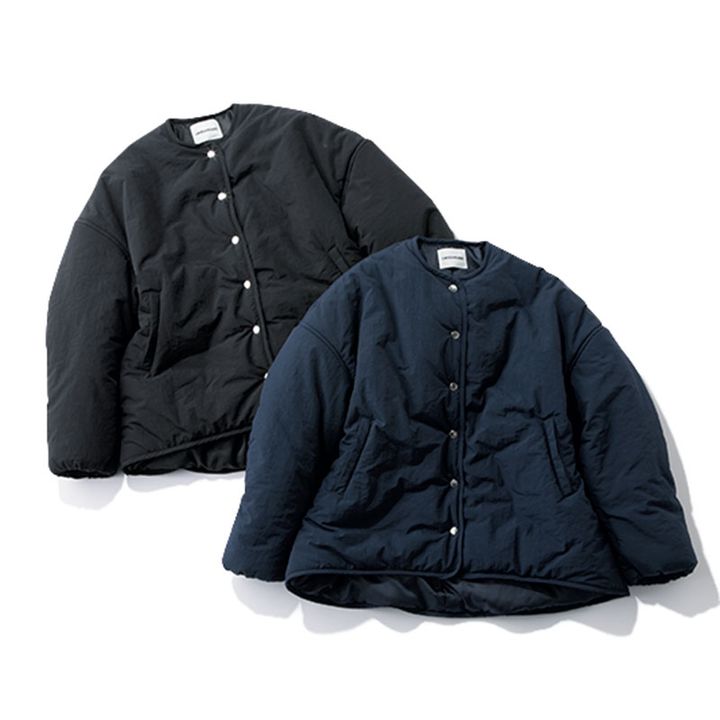 ふんわりしたシルエットで冬のモノトーンコーデを大人可愛く仕上げてくれる一枚。簡単に留められるシルバーのスナップボタンがスポーティで今っぽい。