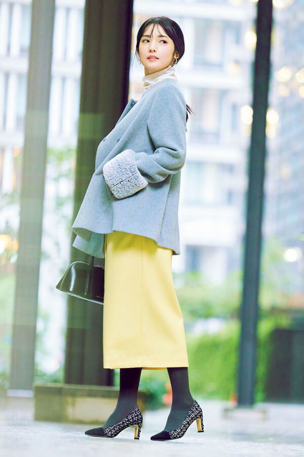 スカート¥20,900/Ballsey(TOMORROWLAND) コート¥27,995/NATURAL BEAUTY BASIC カットソー¥10,450/ストロベリーフィールズ(シュガー・マトリックス) イヤリング¥5,610/ネネンジュエリー(ロードス) バッグ¥15,900/CHARLES & KEITH タイツ¥3,080/フランティカ バイ フクスケ(福助) 靴¥22,000/モー ド・エ・ジャコモ(オギツ)
