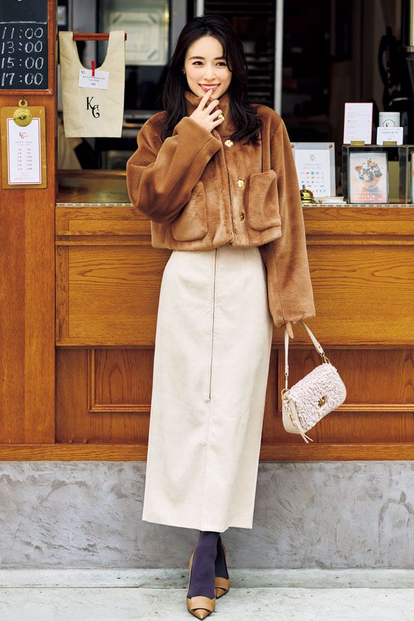 今っぽいバランスを叶えるショート丈のファージャケットとIラインスカートでスタイル美人に。ボリュームのあるスタンドえりのおかげでエコファー&ショート丈ながら、寒さが厳しい日でもあったかい♪