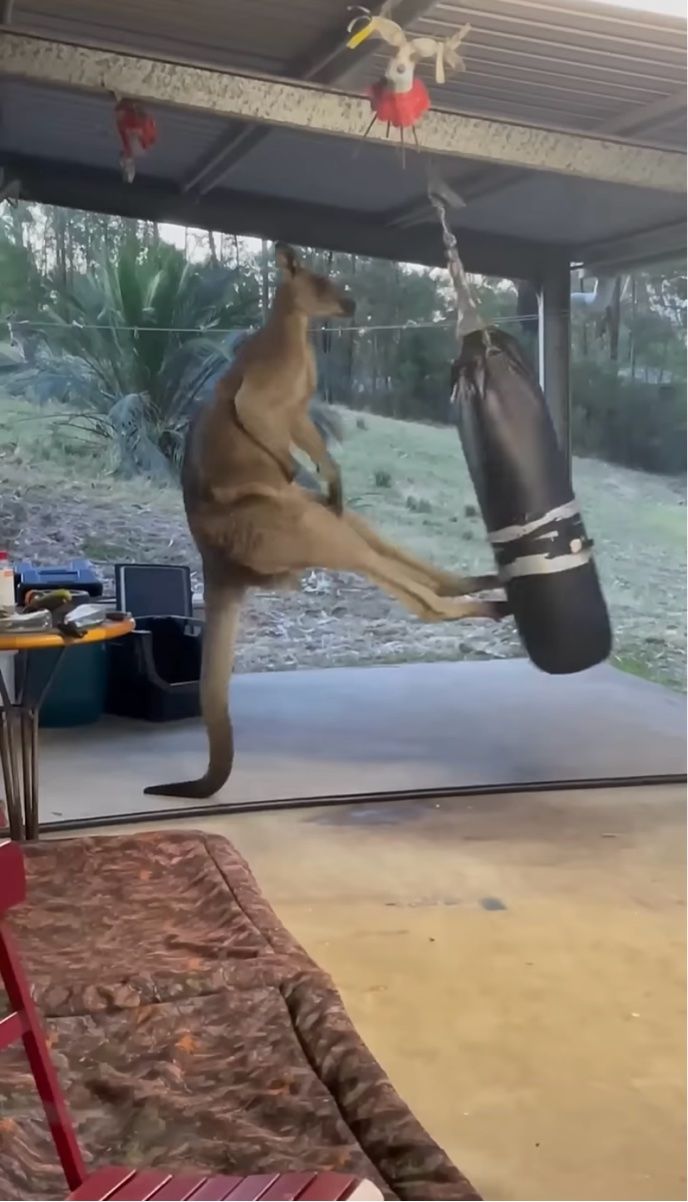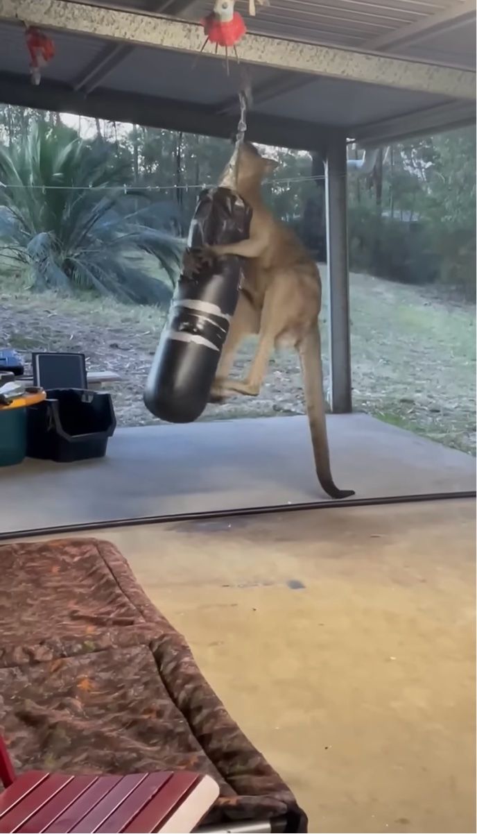 トレーニングに励むカンガルー。 筋肉質な脚でサンドバッグに強烈なキックを放ちます!