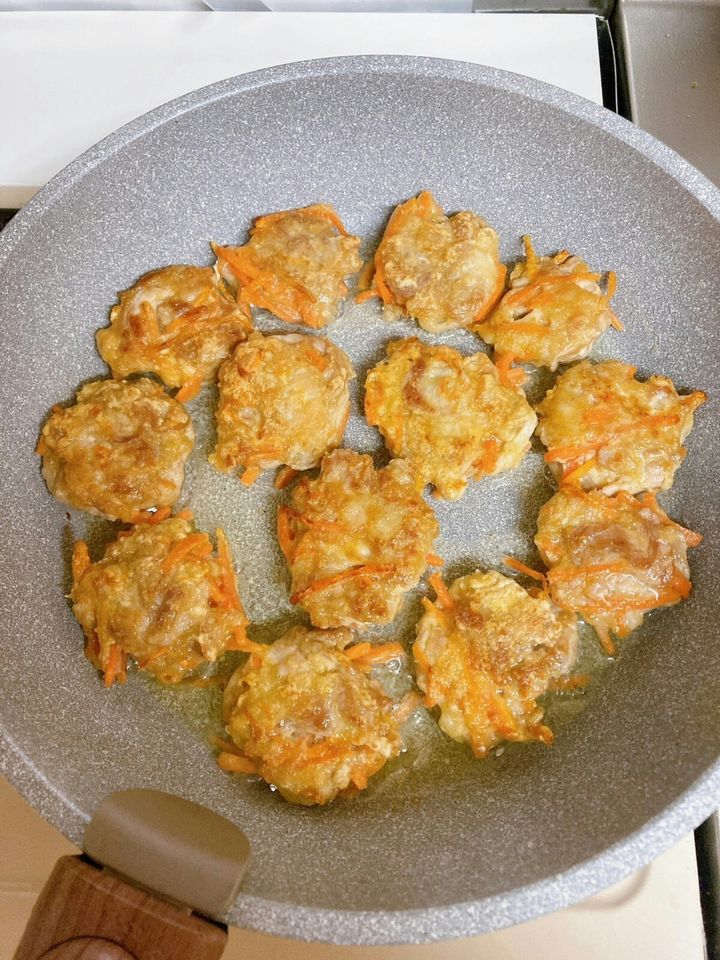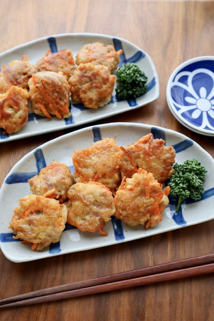 安い豚こま切れ肉とにんじんを使ったつまみ揚げ。お肉だけでなく、にんじんを加えることで食感と風味がよく仕上がります。