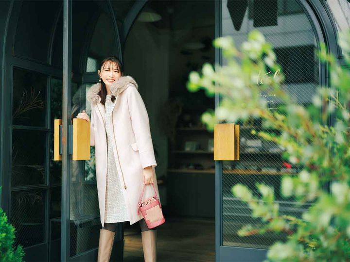 コート¥33,000/31 Sons de mode(ヒロタ) ワンピース¥34,100/ストロベリーフィールズ(シュガー・マトリックス) イヤリング¥7,920/イットアトリエ(14 SHOWROOM) バッグ¥59,400/イアクッチ(イアクッチ 大丸東京店) タイツ¥1,100/満足(福助) シューズ¥40,700/ダイアナ(ダイアナ 銀座本店)