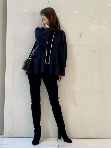 ブーツインした黒のスリムパンツでシンプルな着こなし。上質なネイビーなら黒合わせでも程よい女性らしさをプラスします。パールのロングネックレスがダークトーンコーデのアクセントに。お尻が隠れる丈感でスキニーでも安心です。仕事にも普段着にしてもお洒落風に見えるので働くママさんにもぴったりのスタイルです。