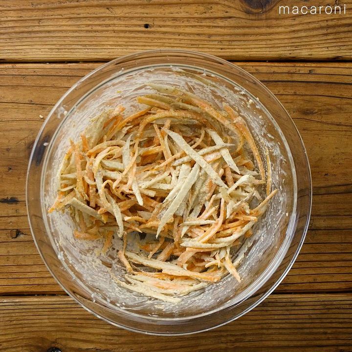 6: ⑤に水気を切ったごぼうとにんじんを加えて混ぜ合わせます。塩を加えて味を整えたら完成です。