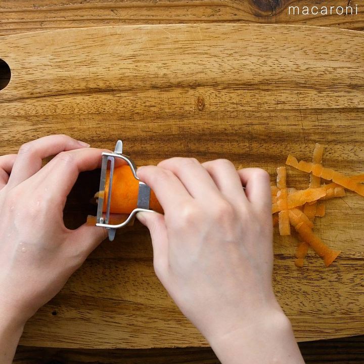 2: にんじんは皮をむき、ごぼうと同じくらいの太さで千切りにします。
