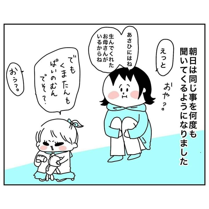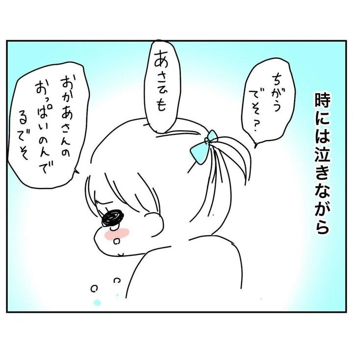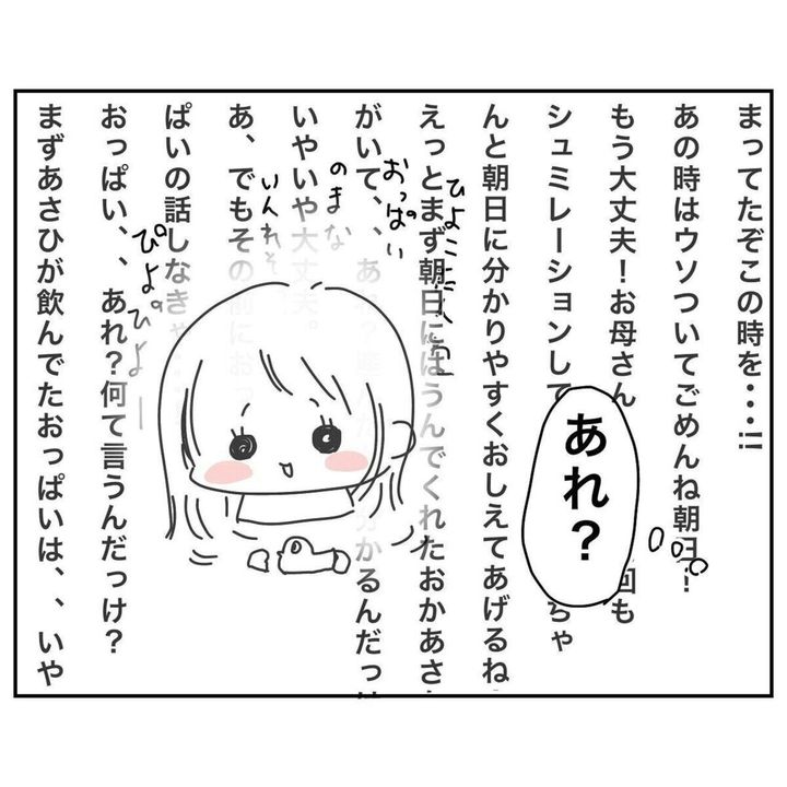 前回と同じように「あさひはおかあさんのおっぱいのんでたんだよね?」と聞かれたフォロワーさんは「ついにこの時が来た!」と気を引き締めます。失敗をくり返さないために頭の中ではさまざまな言葉が出てきていますが、それを何一つ口に出すことができずにいました。