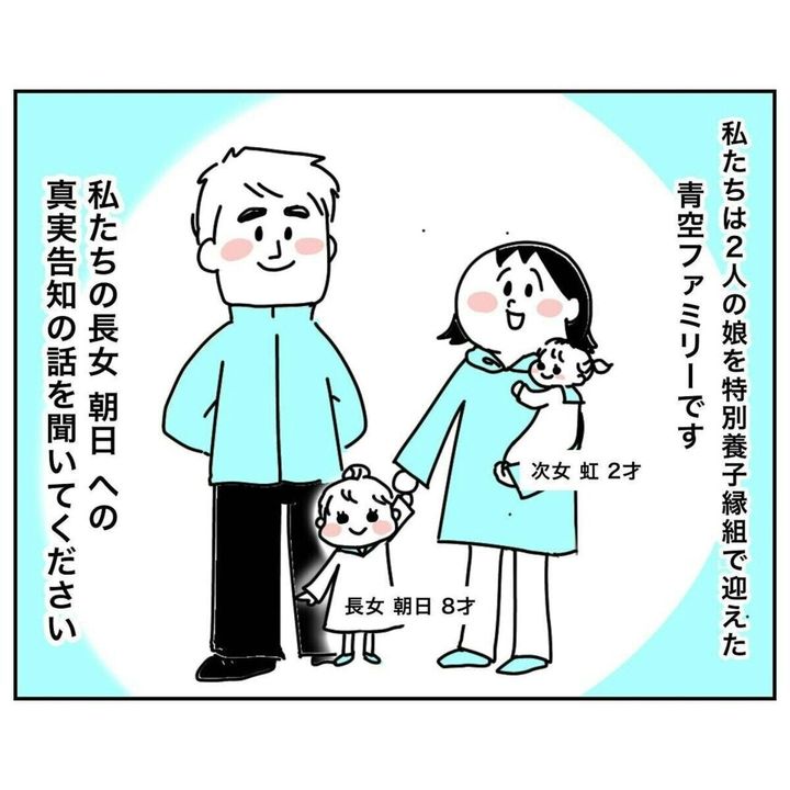 「真実告知」という言葉を知っていますか?育ての親とは別に、生みの親がいることを伝えることをそう呼ぶそうです。このお話はあきママ(@aki.engumi)さんのフォロワーさん・青空ファミリーの体験談で、特別養子縁組で迎えた長女・朝日ちゃんが3歳になり、ある質問をされたことから始まります。いつかは真実告知をしなければと思っていたものの、突然のことに頭が真っ白になってしまったフォロワーさん。無事に伝えることができるのでしょうか?『真実告知にまつわるエトセトラ』どうぞご覧ください。
