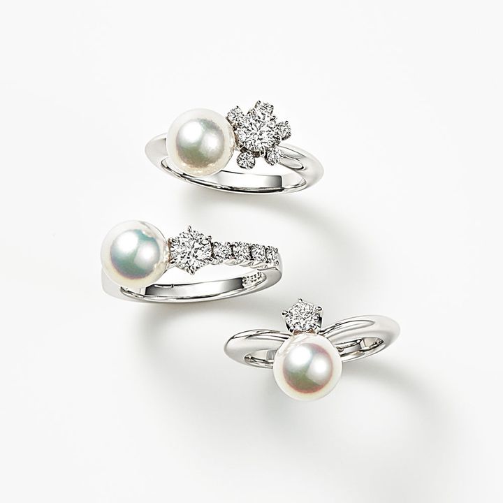 〈上から〉リング「ミキモト リュミエール ペルル」〈PT×あこや真珠×DIA〉¥700,000~ リング「ミキモト リュミエール ペルル」〈PT×あこや真珠×DIA〉¥700,000~リング「ミキモト リュミエール ペルル」〈PT×あこや真珠×DIA〉¥396,000(すべてミキモト/ミキモト カスタマーズ・サービスセンター)