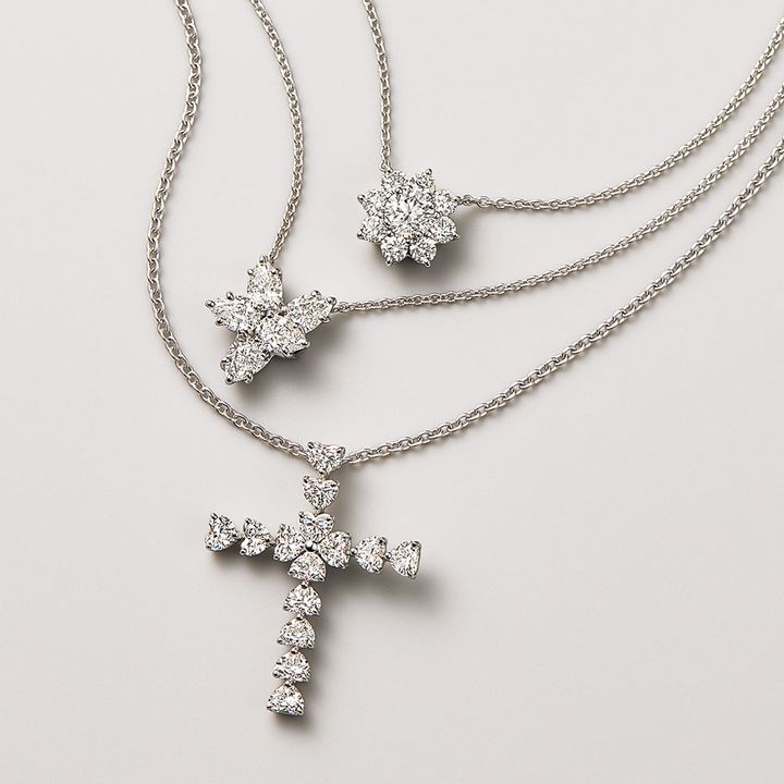 ペンダント「サンフラワー・ミニ」〈PT×DIA〉¥2,156,000ヒイラギのリースの重なり合う葉からインスピレーションを得たコレクション。ペンダント「クラスター」〈PT×DIA〉¥2,552,000ハートシェイプの大粒のダイヤモンドが織りなす華やかなクロス。ペンダント「ハートシェイプ・クロス」〈PT×DIA〉¥2,244,000(すべてハリー・ウィンストン/ハリー・ウィンストン クライアントインフォメーション)